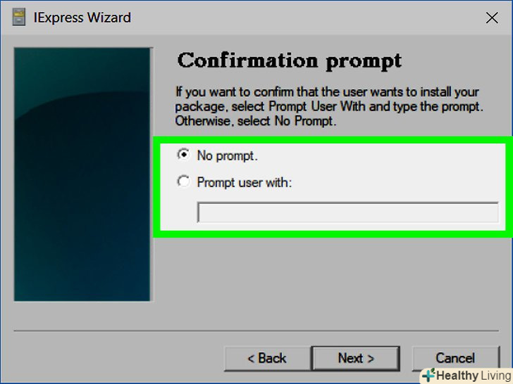 Подумайте про вікно із запитом.якщо ви хочете, щоб користувач підтвердив бажання запустити EXE-файл, поставте прапорець у опції " Prompt user with "(запит у користувача) і введіть текст запиту про підтвердження. В іншому випадку натисніть "Далі".- Коли користувач запустить ЕХЕ-файл, відкриється вікно з введеним вами текстом (якщо ви вибрали опцію із запитом).