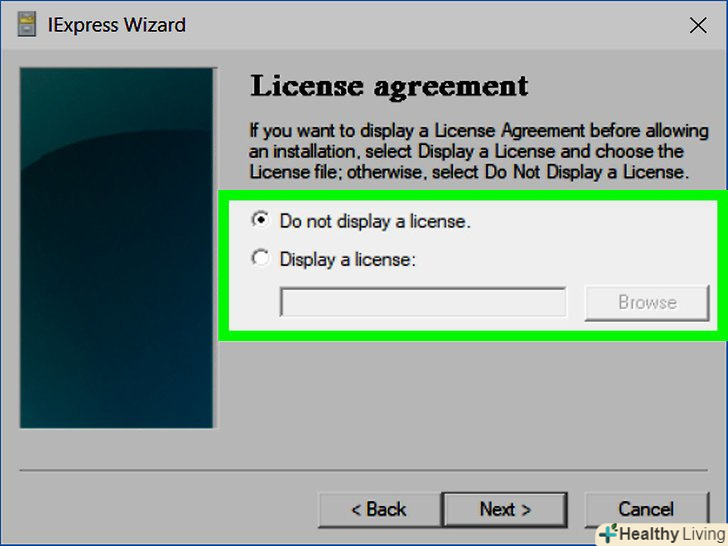 Подумайте про вікно з ліцензійною угодою. якщо ви хочете, щоб на екрані відобразився текст Ліцензійної угоди, поставте прапорець біля опції «Display a license» (показати ліцензію), потім натисніть «Browse» (Огляд), щоб вибрати документ з текстом Ліцензійної угоди, а потім натисніть «Відкрити». В іншому випадку натисніть "Далі".