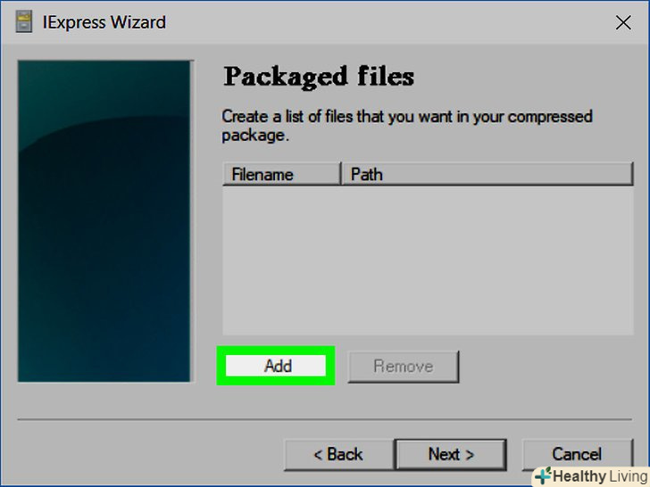 НатиснітьAdd (додати). ця кнопка знаходиться в нижній середній частині вікна. Відкриється нове вікно Провідника, в якому можна вибрати файли, які будуть включені в інсталяційний EXE-файл.- Файли, включені в інсталяційний EXE-файл, будуть встановлені, коли користувач запустить EXE-файл.