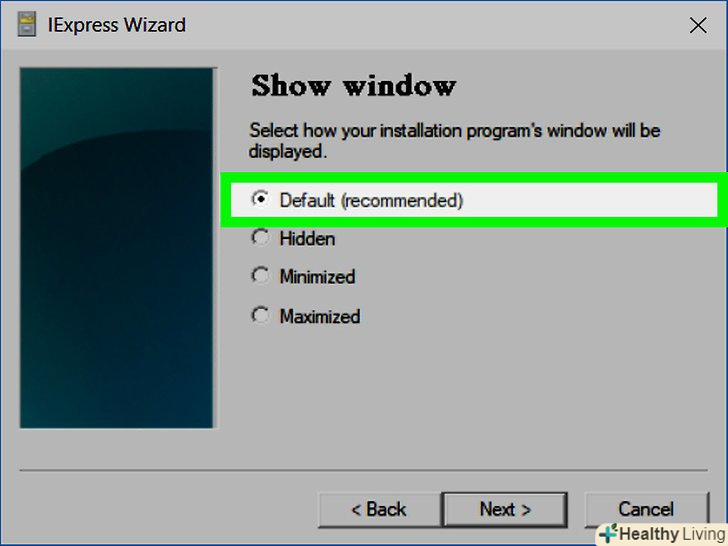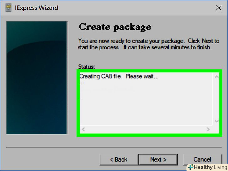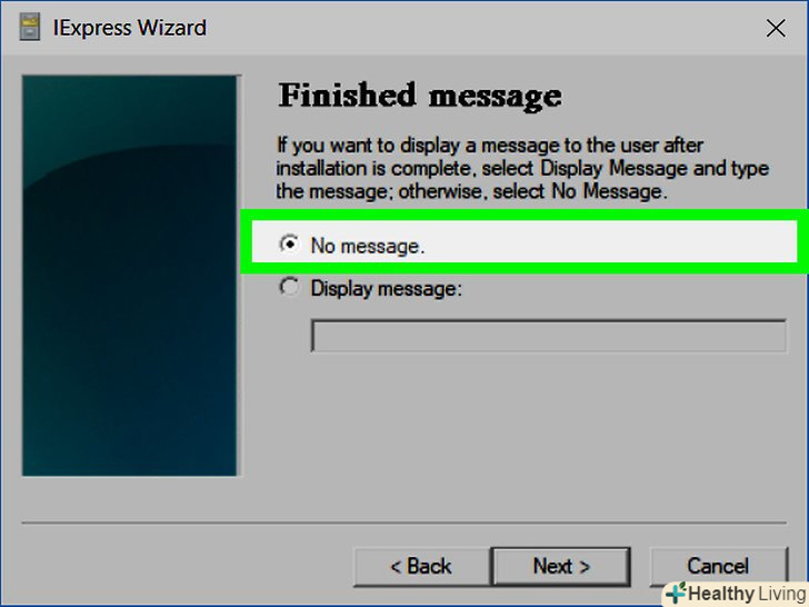 Подумайте про вікно з заключним повідомленням.таке повідомлення з'являється на екрані по завершенні процесу установки ЕХЕ-файлу. Поставте прапорець біля опції " Display message "(Показати повідомлення), потім введіть текст повідомлення, а потім натисніть «Далі».- Якщо ви не хочете, щоб на екрані відображалося заключне повідомлення, просто натисніть «Далі».