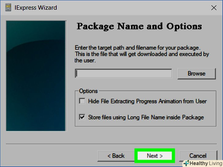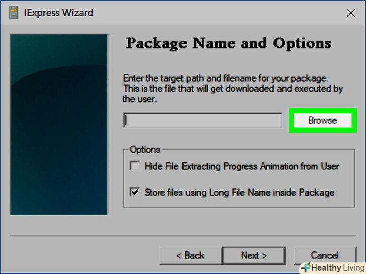 Додайте програму, яку потрібно встановити. це програма в EXE-файлі, який був створений раніше. Натисніть " Browse "(огляд), Відкрийте папку з файлом, клацніть по ньому і натисніть «Зберегти».- Якщо хочете, поставте прапорець у опції "Hide File Extracting Process Animation from User" (приховати відображення процесу вилучення файлів), щоб інсталяційний файл працював без зайвих візуальних ефектів.