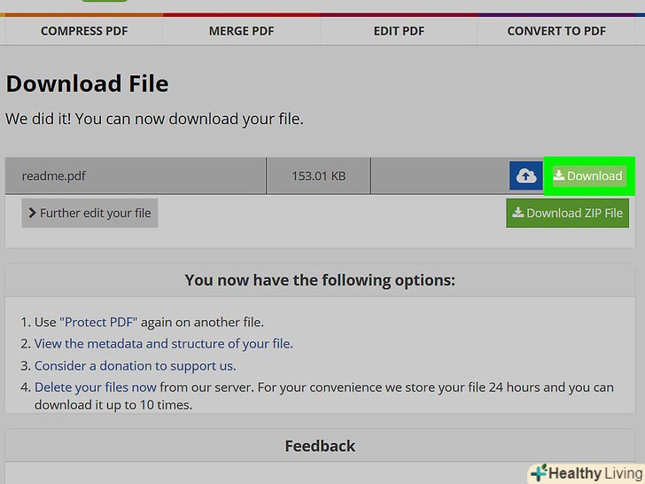 НатиснітьЗавантажити. ця світло-зелена кнопка знаходиться у верхній правій частині сторінки. Захищений паролем PDF-файл буде завантажений на комп'ютер. Тепер, щоб відкрити або відредагувати документ, потрібно ввести відповідні паролі.- Також можна клацнути по "Download ZIP File" (завантажити zip-файл) посередині сторінки, щоб завантажити архів зі стисненим PDF-файлом. Виберіть цей варіант, якщо документ дуже великий.