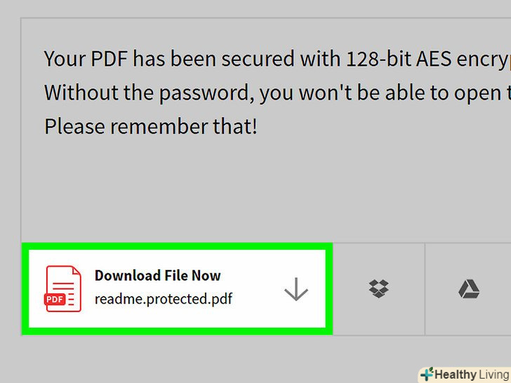НатиснітьЗавантажити файл.ця кнопка відобразиться в лівій частині сторінки, коли на документ буде встановлено пароль. Захищений паролем PDF-файл буде завантажений на комп'ютер. Тепер, щоб відкрити документ, потрібно ввести пароль.