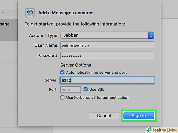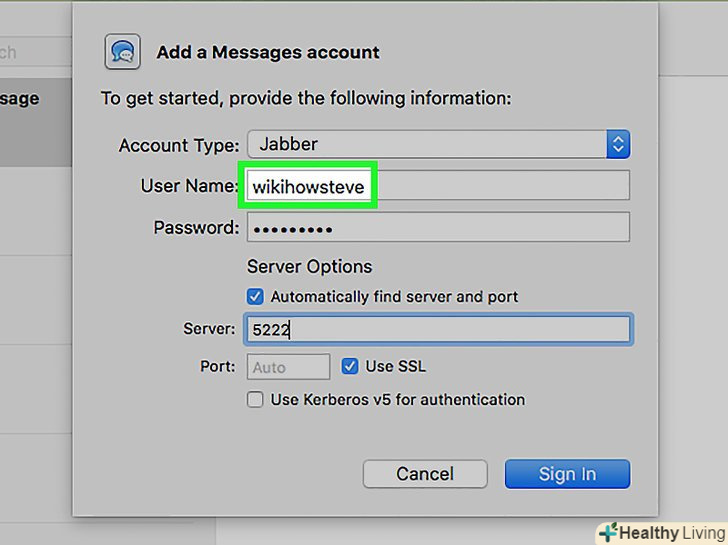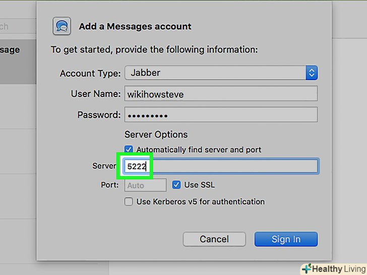 У наступні поля введіть параметри сервера і порту (якщо необхідно).- Ця інформація може вам знадобитися для входу на приватний сервер. Адреса сервера може бути різною, але Jabber зазвичай використовує порт 5222.[3]