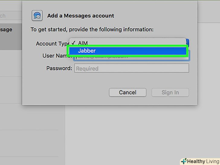 Щоб додати обліковий запис Jabber до Програми "повідомлення" на Mac, запустіть програму, перейдіть на сторінку < span class="nowrap" title= " This is not a clickable button; it illustrates the button one should find." style="font-family: Segoe UI, Frutiger, Frutiger Linotype, Dejavu Sans, Helvetica Neue, Arial, sans-serif;letter-spacing:0px;padding:0em .6em; border:1px solid; border-color:#AAA #555 #555 #AAA; -moz-border-radius: 0px; -webkit-border-radius: 0px; border-radius: 0px; background-color: #F2F2F2; background-image: -moz-linear-gradient(top, #FCFCFC, #E0E0E0); background-image: -o-linear-gradient(top, #FCFCFC, #E0E0E0); background-image: -webkit-linear-gradient(top, #FCFCFC, #E0E0E0); background-image: linear-gradient(top, #FCFCFC, #E0E0E0);">додати аккаунт, виберіть тип облікового запису «Jabber» і введіть свої облікові дані. Додаток "Повідомлення" для iOS на даний момент не підтримує додавання сторонніх акаунтів.[1]
