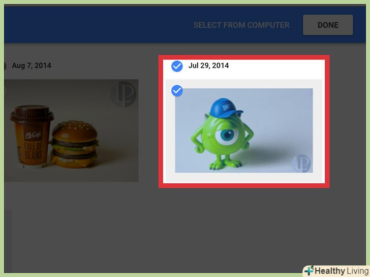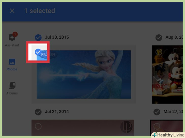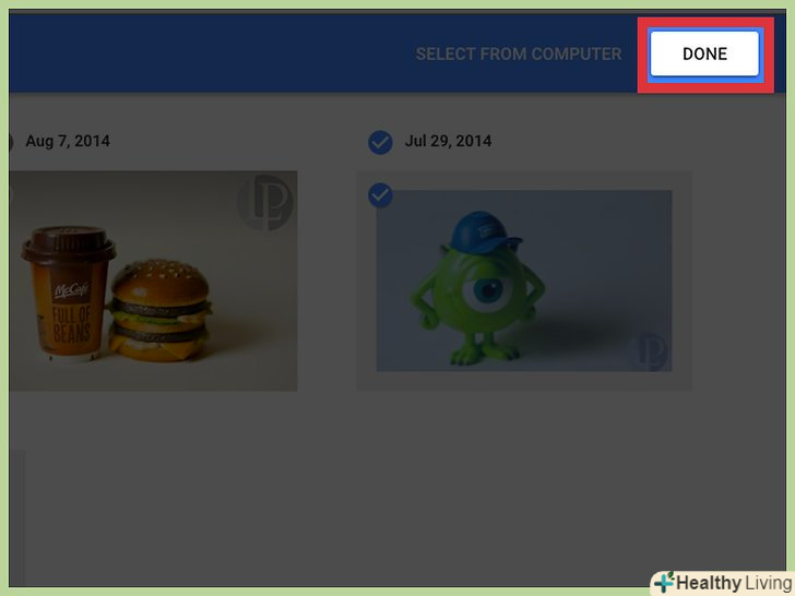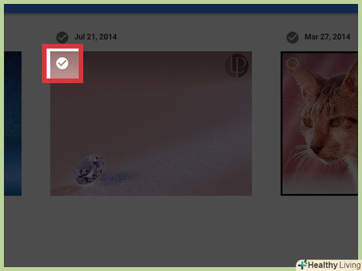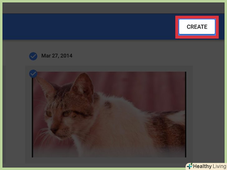 Натисніть іконку "Додати фото". вона знаходиться в правій верхній частині екрана і виглядає як фотографія зі знаком плюс. На екрані відобразиться список ваших фотографій (які не входять в альбом) кожна з яких буде мати гурток в лівому верхньому кутку.[3]