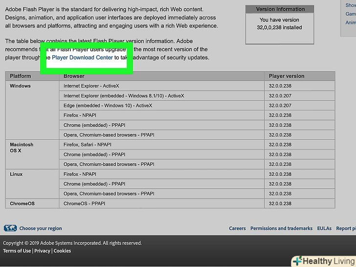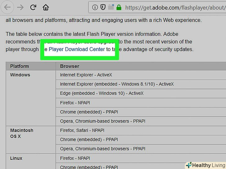 Натисніть посилання " Player Download Center "(Центр завантаження Flash Player). вона знаходиться в другому абзаці тексту, який розташований над таблицею (або просто перейдіть за адресою https://get.adobe.com/flashplayer/).