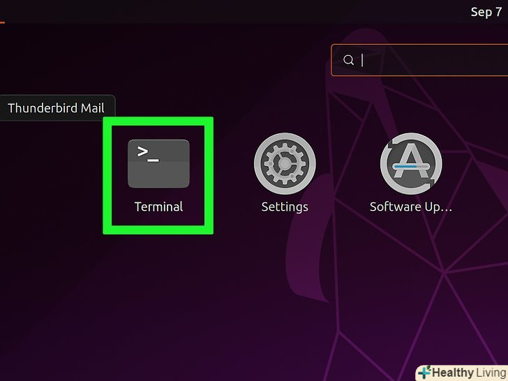 Відкрийте термінал. клацніть (двічі клацніть) по значку програми «термінал«, який виглядає як чорний квадрат з білими символами»gt;_".- Також можна просто натиснутиAlt+Ctrl+t, щоб запустити термінал.