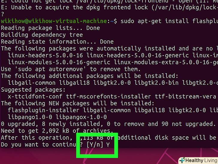 Підтвердіть установку, коли буде запропоновано. Введіть Y, а потім натисніть ↵ Enter. Запуститься процес оновлення Flash Player.