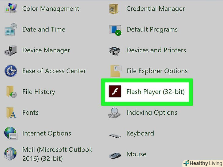 Клацніть поFlash Player (32 біта). ви знайдете цей значок у вигляді білої літери " f " на темно-бордовому тлі посередині вікна. Відкриється вікно Flash Player.- Можливо, вам доведеться почекати близько 30 секунд, перш ніж ця опція відобразиться у вікні панелі управління.