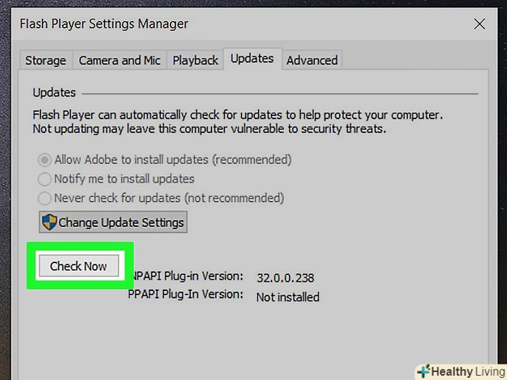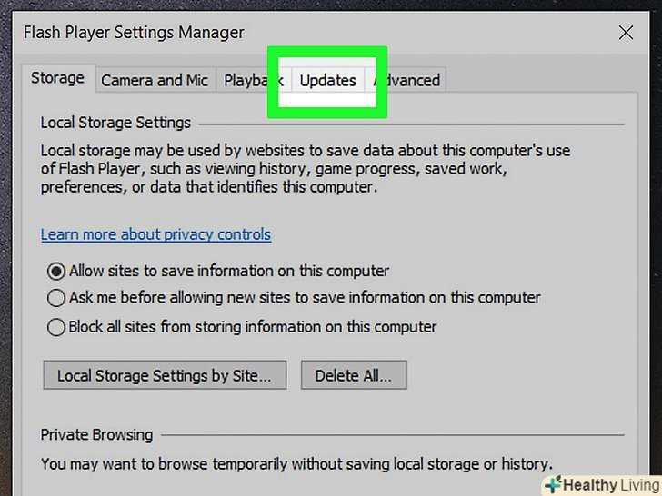 Клацніть поОновлення.ця вкладка знаходиться у верхній частині вікна Flash Player.