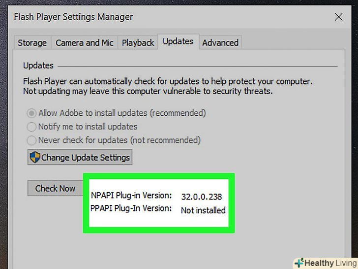З'ясуйте номер поточної версії.у розділі "версія модуля NPAPI" ви знайдете число-це номер версії використовуваного Flash Player.- Станом на жовтень 2018 року останньою версією Adobe Flash є версія 31.0.0.122.