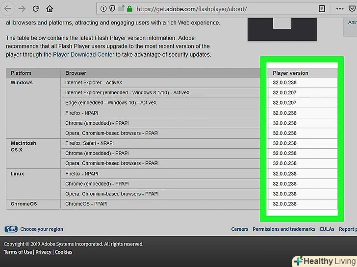 Перевірте номер версії для свого браузера. знайдіть ім'я свого веб-браузера в стовпці «Browser» (Браузер), а потім подивіться на номер версії праворуч від імені браузера — якщо цей номер більше номера, знайденого вами в меню Flash Player, поновіть Flash Player.- Якщо номер біля імені браузера збігається з номером, знайденим в меню Flash Player, оновлювати Flash Player не потрібно.