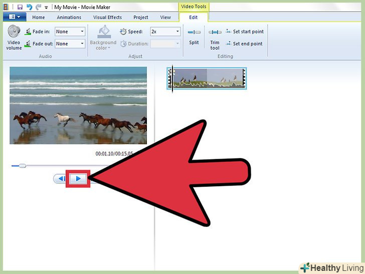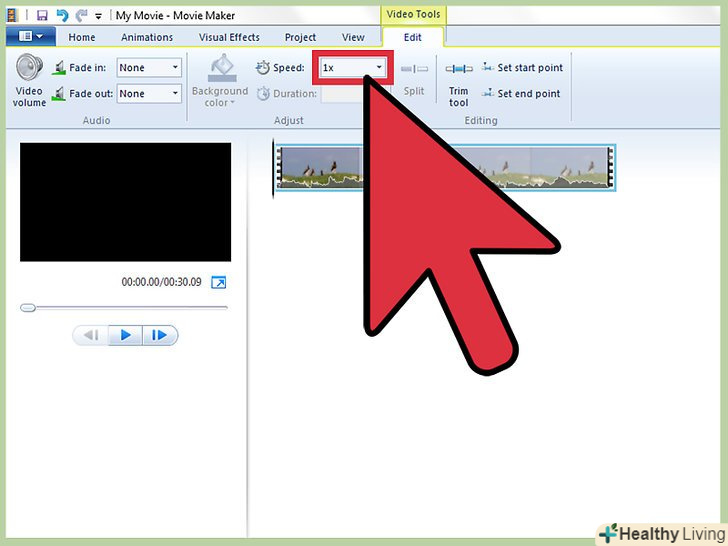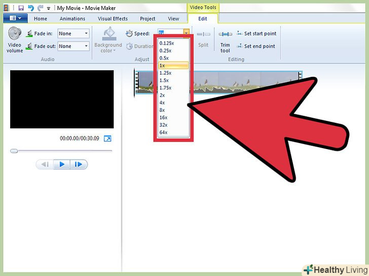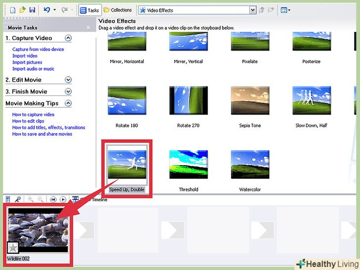 Виберіть "прискорити в два рази".прокрутіть різні відеоефекти, поки не знайдете опцію»прискорити в два рази". Натисніть на неї лівою кнопкою миші і перетягніть ефект на монтажну стрічку, на той кліп, який ви хочете прискорити. Це подвоїть швидкість вашого відеокліпу.[3]- В Windows Movie Maker немає більш точної функції прискорення відео, ніж ця. Якщо вам необхідна програма з великими можливостями, знайдіть інший відеоредактор.
