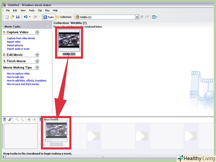 Відкрийте відео в Windows Movie Maker. якщо ви цього ще не зробили, імпортуйте відеокліп в Windows Movie Maker, потім перетягніть файл на монтажну стрічку в нижній частині вікна. Якщо ви хочете прискорити все відео, тоді залиште його як є. Якщо ж ви хочете прискорити лише певну його частину, тоді вам доведеться розділити відео на кілька кліпів.