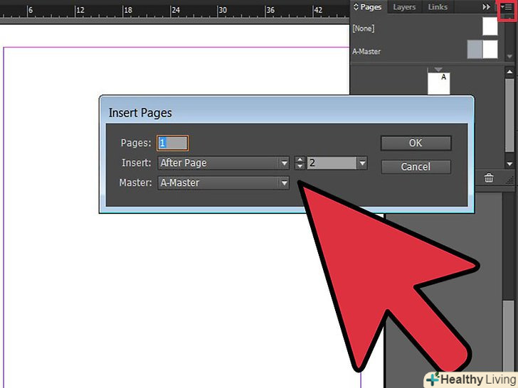Збільште кількість сторінок автоматично. в InDesign, ви зможете додати кілька сторінок за один раз.- Відкрийте палітру Pages і натисніть лівою кнопкою на субменю.