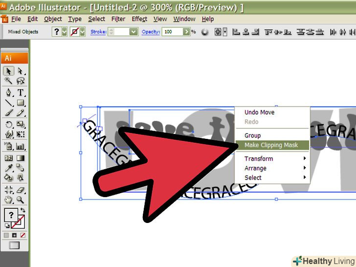 Після того, як ви закінчите працювати з вашим текстом, створіть новий прямокутник такого ж розміру, як і зона для роботи (468x60 пікселів), поставте його на передній план, після цього, поставте його, як на картинці і виберете всі елементи, натисніть правою кнопкою і використовуйте опцію Make Clipping Mask