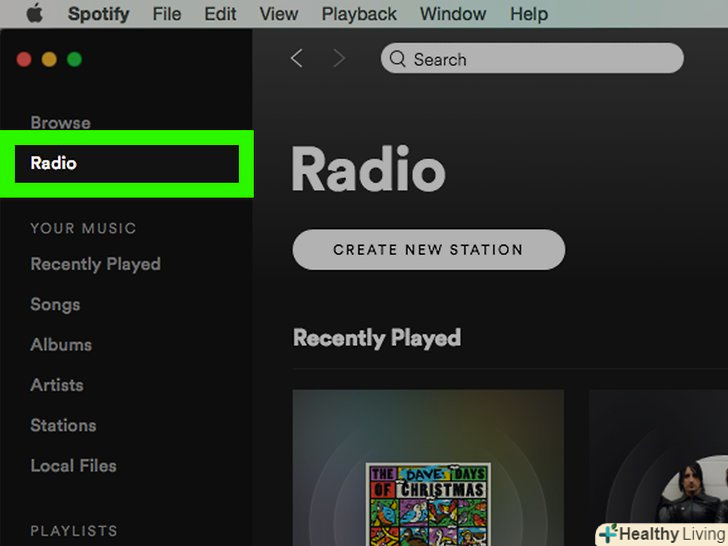 Увімкніть радіо в Spotify. виберіть вкладку Radio (радіо) на мобільному пристрої або натисніть Radio у верхньому лівому куті вікна програми для ПК. Тут можна вибирати або знайти радіостанції з піснями різних виконавців, жанрів і альбомів, які вам подобаються, а також схожою музикою.