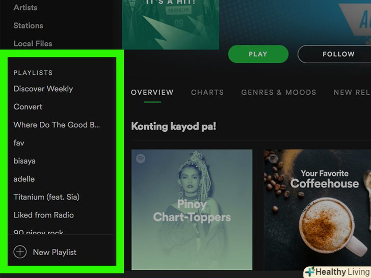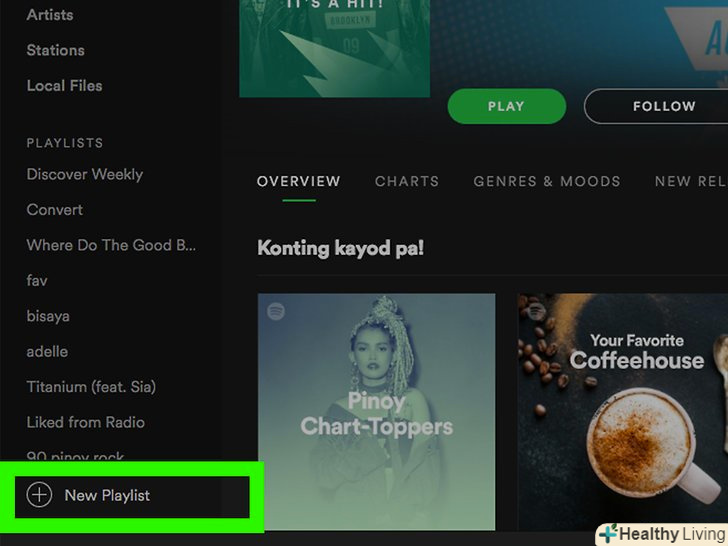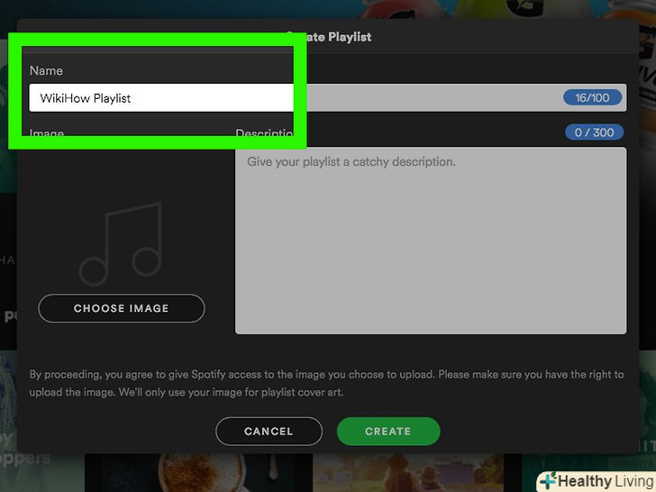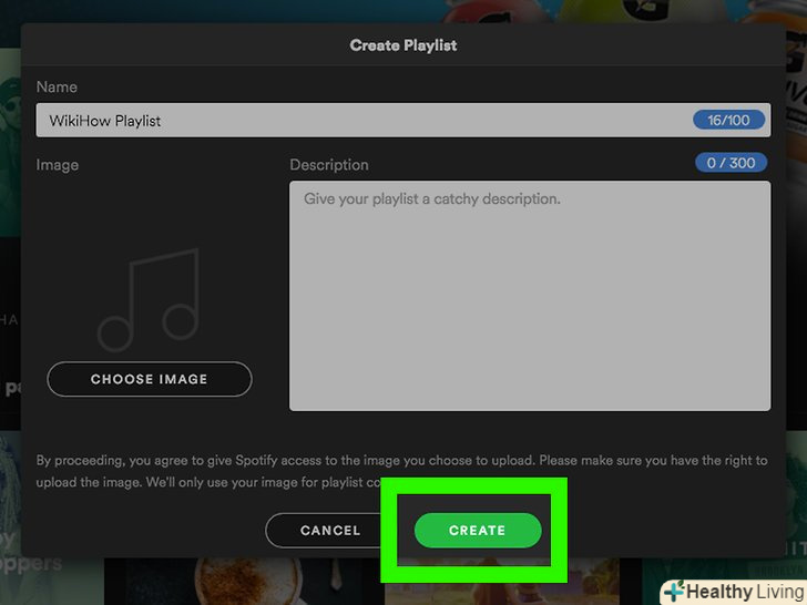 Створіть новий список. натисніть CREATE PLAYLIST (створити список) в середній частині екрана (мобільний пристрій) або натисніть + New Playlist (створити новий список) в лівому нижньому кутку вікна Spotify (ПК).