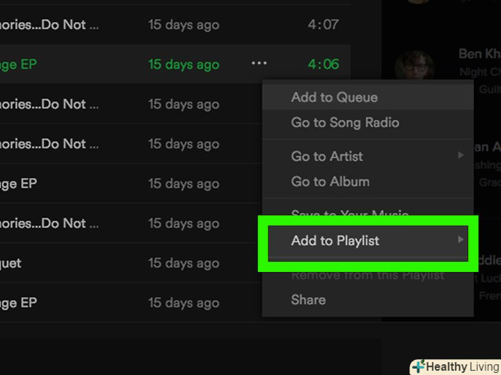Додайте музику до списку.натисніть ... навпроти назви альбому або пісні виконавця, потім натиснітьAdd to Playlist (додати до списку) і виберіть назву списку. На ПК натисніть ... навпроти назви альбому або пісні виконавця, потім натисніть Add to Playlist і виберіть назву списку в випадаючому меню.