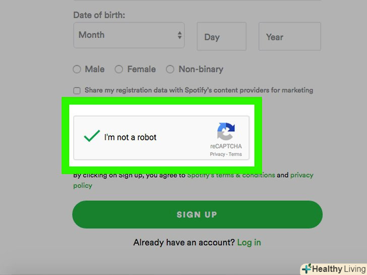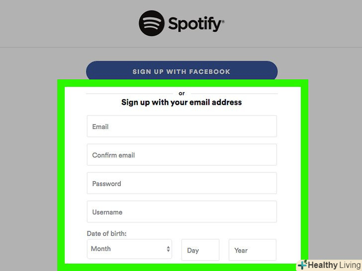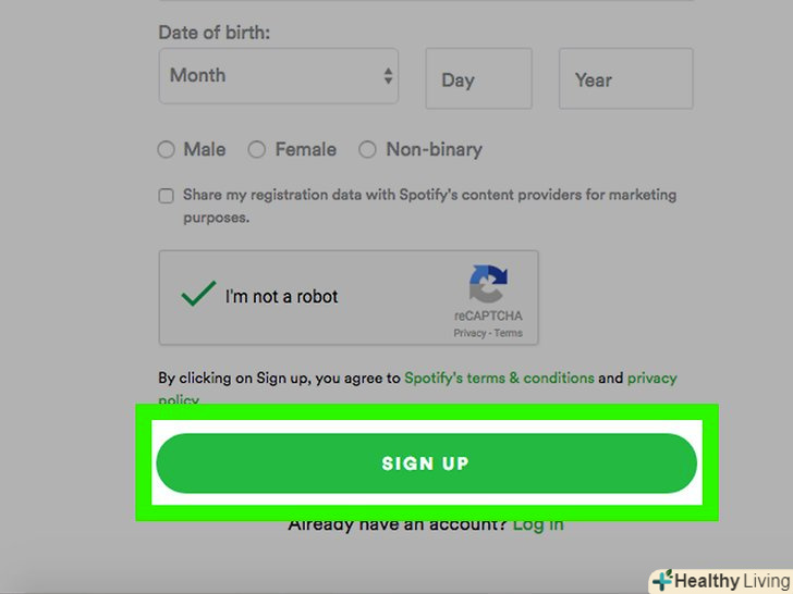НатиснітьSIGN UP (зареєструватися).Зелена кнопка знаходиться в нижній частині сторінки. Буде створено ваш аккаунт в Spotify.- Якщо ви використовуєте ПК, то після реєстрації вам запропонують завантажити файл з програмою.