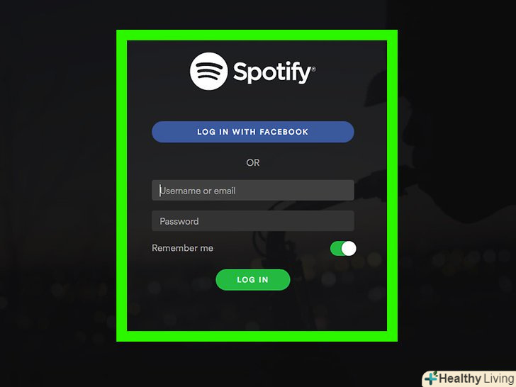 Увійдіть до Spotify. вкажіть своє ім'я користувача (адресу електронної пошти) і пароль, потім натисніть LOG IN (Увійти). Далі відкриється головна сторінка сервісу Spotify, на якій можна слухати музику.- Якщо ви зареєструвалися в Spotify за допомогою Facebook, тоді натиснітьLOG IN WITH FACEBOOK (Увійти за допомогою Facebook) і введіть дані для входу.