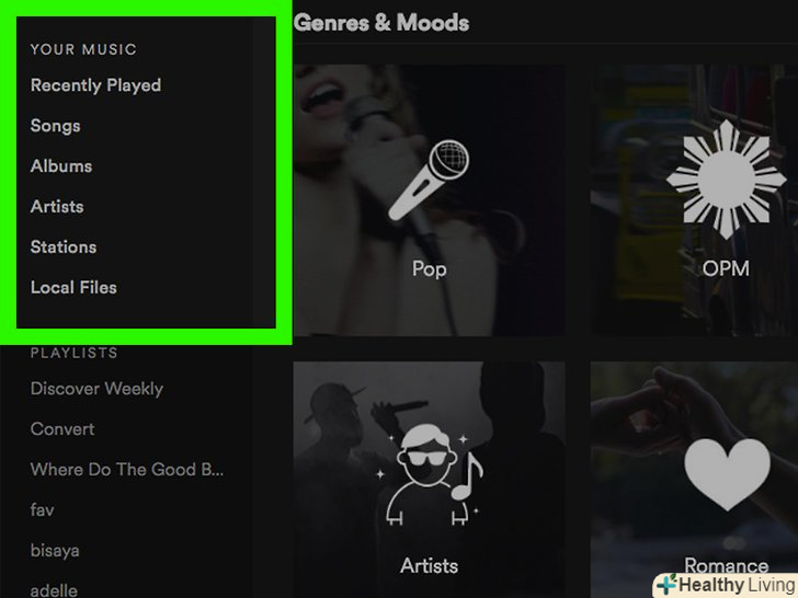 Зайдіть в музичну бібліотеку. натисніть Your Library (ваша бібліотека) в нижній частині екрана на мобільному пристрої або погляньте на блок в лівій частині домашньої сторінки на ПК. Доступні наступні варіанти:- Playlists (Списки відтворення) на мобільному пристрої — Виберіть цей пункт, щоб переглянути створені списки відтворення.