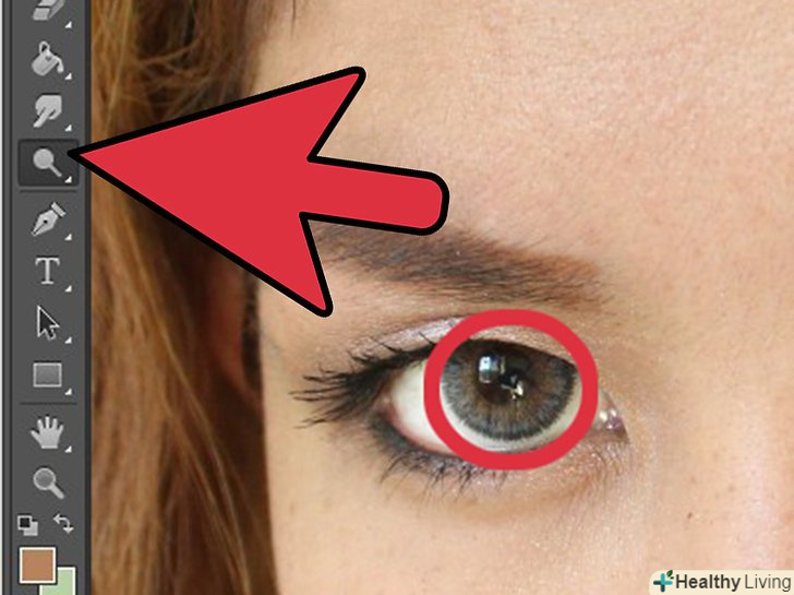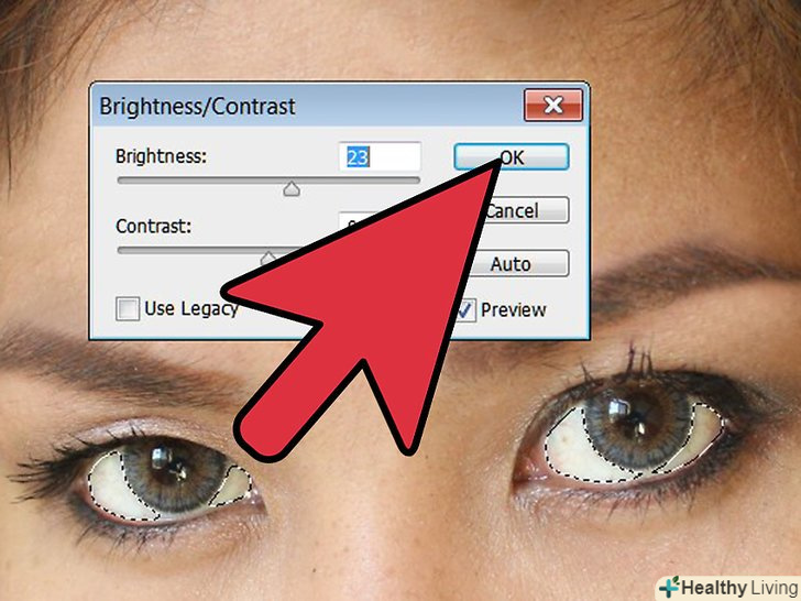 Надайте білкам ваших очей біле забарвлення.візьміть інструмент "free selection" і розтушуйте його на 1-5 пікселів в залежності від вашої фотографії. Виберіть білки обох очей. Перейдіть до збільшення яскравості / контрасту і надайте їм блиск.