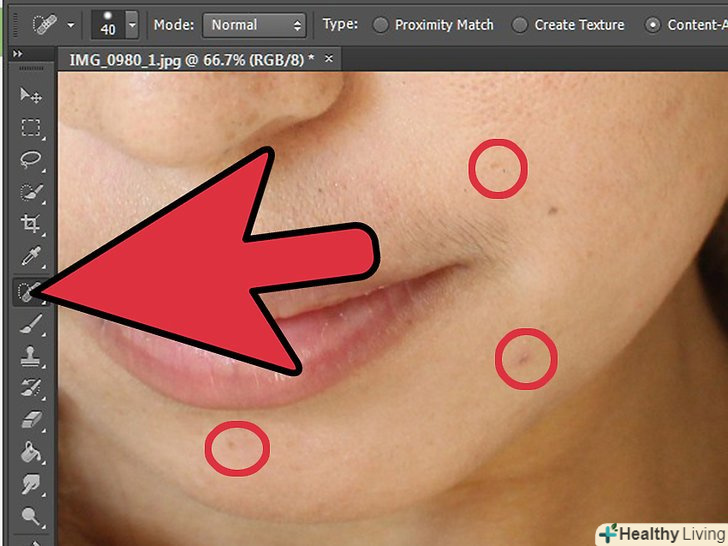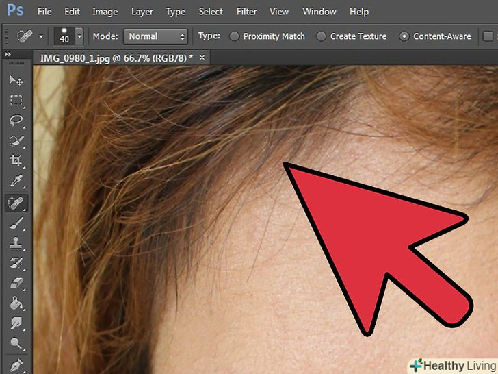 Позбудьтеся від прищів! візьміть інструмент "clone stamp", натисніть на клавіатурі Alt на тому місці, де шкіра біля прища виглядає добре, і тоді перетягніть її на прищ. Ви можете робити це стільки разів, скільки вам буде потрібно.