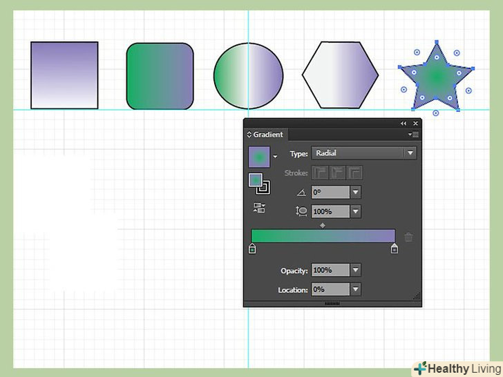 Для отримання четвертого градієнта виберіть квадрат, щоб повернутися до першого градієнта на панелі градієнтів.змініть тип градієнта з лінійного на радіальний. Потім виділіть багатокутник і натисніть на кнопку"градієнтна заливка".