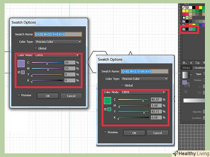 Створіть два зразки. встановіть наступні комбінації кольорів: Бузковий: C=50, M=53, Y=0, K=0 ; зелений: C=80.57, M=3.08, Y=83.71, K=0.08.