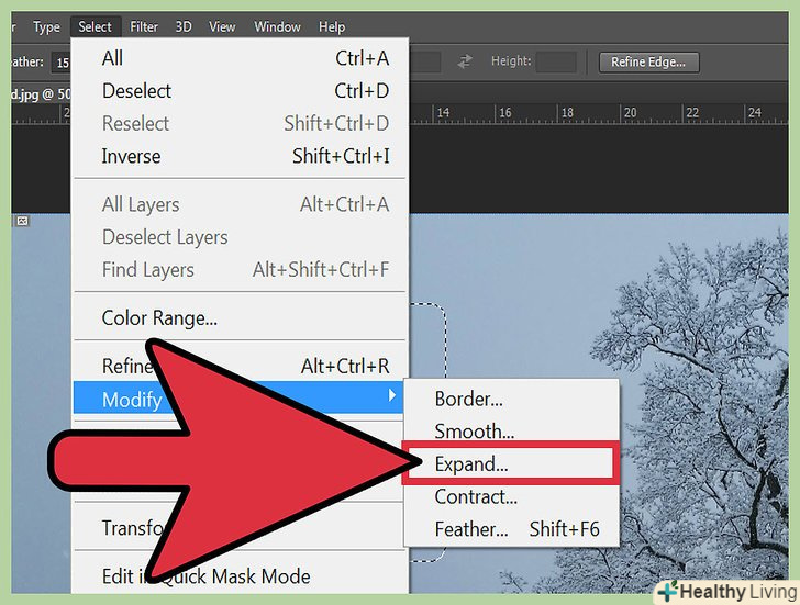 Використовуйте "Заливка з урахуванням вмісту", щоб видалити предмети і прості недоліки.наприклад, в момент знімка на об'єктив потрапив пил, в результаті чого на пейзажній фотографії з'явилася велика буре пляма на тлі неба. Заливка з урахуванням вмісту дозволяє приховати такий недолік. Використовуйте інструмент " Швидке виділення "(під іконкою "ласо"» для вибору плями. Далі:- Клацніть "виділення" → "Модифікація" → "розширити".