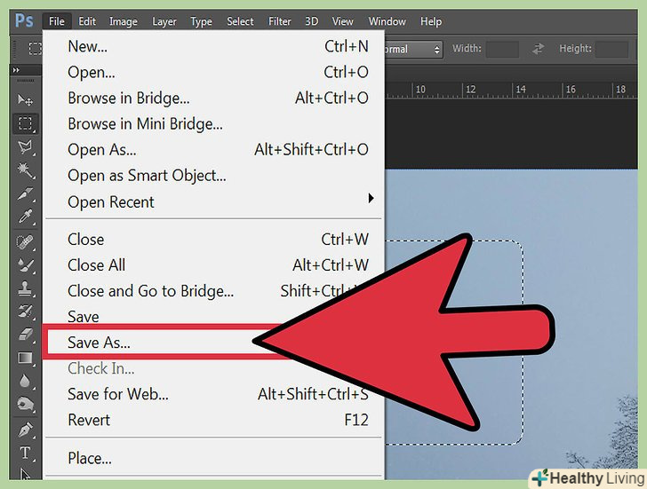 Використовуйте функцію "Зберегти як копію", щоб створити дублікат зображення до початку редагування.завжди рекомендується (особливо новачкам) зберігати копію зображення до початку обробки. Після цього можна сміливо експериментувати і не боятися зробити помилку. Завжди можна натиснути функцію "скасування", але все ускладнюється після декількох дій на зразок кадрування, зміни колірного тону і посилення різкості.- Клацніть "Файл" → "Зберегти як" або натисніть Ctrl + Shift + S (Windows) або Cmd + Shift + S.