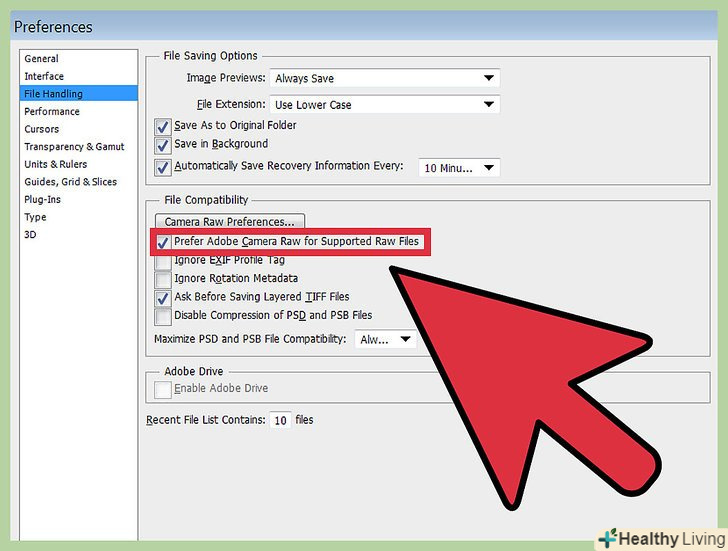 - Клацніть "Налаштування Camera Raw «і встановіть» обробку JPEG і TIFF «як»автоматично відкривати всі підтримувані файли".[8]