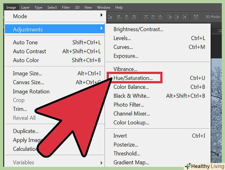 Змініть колірний тон зображення, якщо всі об'єкти пофарбовані в неправильний колір.дана ситуація може бути викликана внутрішнім освітленням, в результаті чого знімок буде виглядати жовтим або зеленим. Налаштування колірного тону в тому ж пункті меню дозволяють змінити загальну палітру кольорів знімка, щоб надати йому незвичайний художній ефект або виправити колірні проблеми.- Клацніть "Зображення" → "Корекція" → "колірний тон / насиченість".