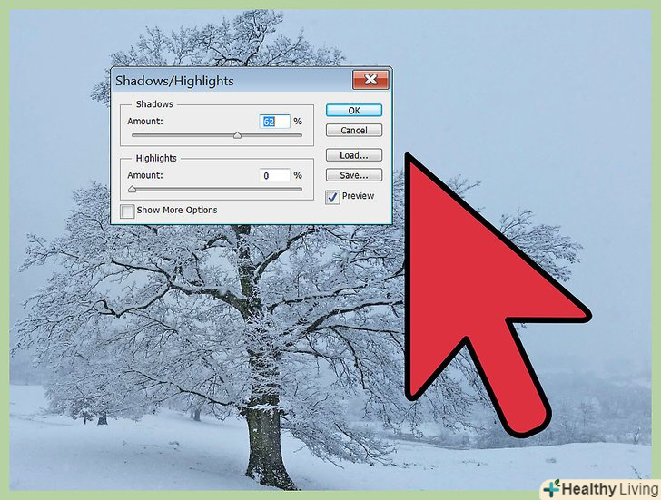 Використовуйте налаштування "тіні / світла", щоб прибрати занадто яскраві ділянки і висвітлити деталі в тінях.найчастіше функцію використовують в тому випадку, коли сонце утворює більше і негарне пляма білого світла в одному з кутів знімка і вимиває частину зображення. Також використовуйте цей пункт, якщо тінь приховує частину обличчя. Пункт "тіні / світла"зачіпає найяскравіші і найтемніші ділянки знімка і не змінює середні тони:- Клацніть "Зображення" → "Корекція" → "тіні / світла".