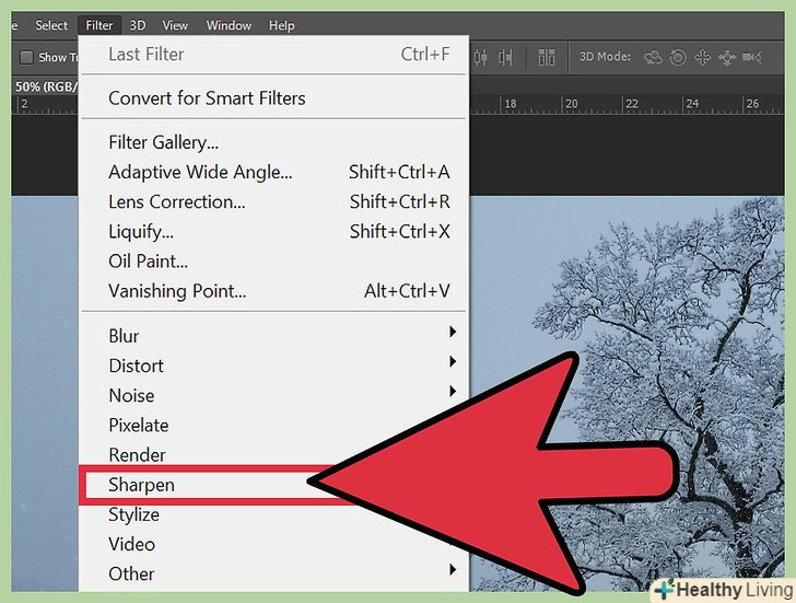 Використовуйте фільтр посилення різкості, щоб виправити злегка розмиті або нечіткі знімки. цей фільтр не всемогутній і не зможе зробити чіткими сильно розмиті фотографії, зате точно зробить злегка "нерізкі" зображення різкими з чітко окресленими лініями. Як використовувати фільтр:- Виберіть вкладку "фільтр" у верхньому меню програми.