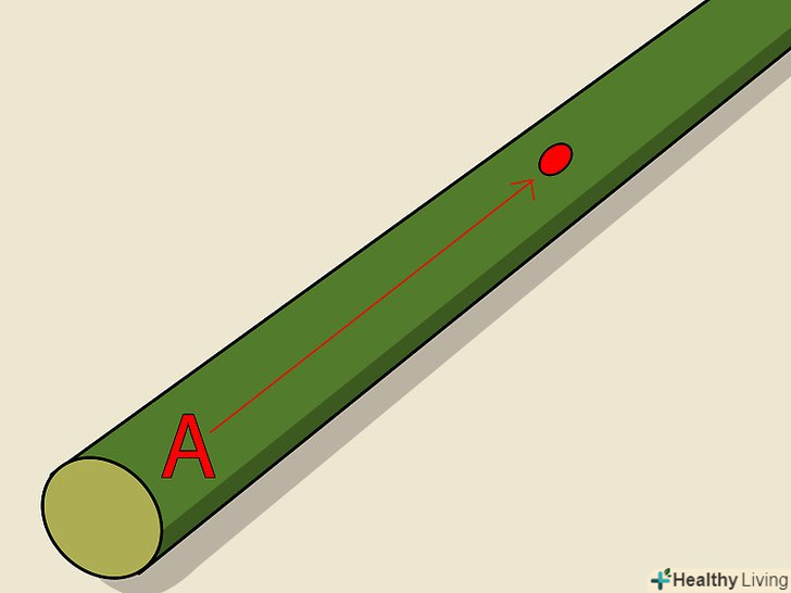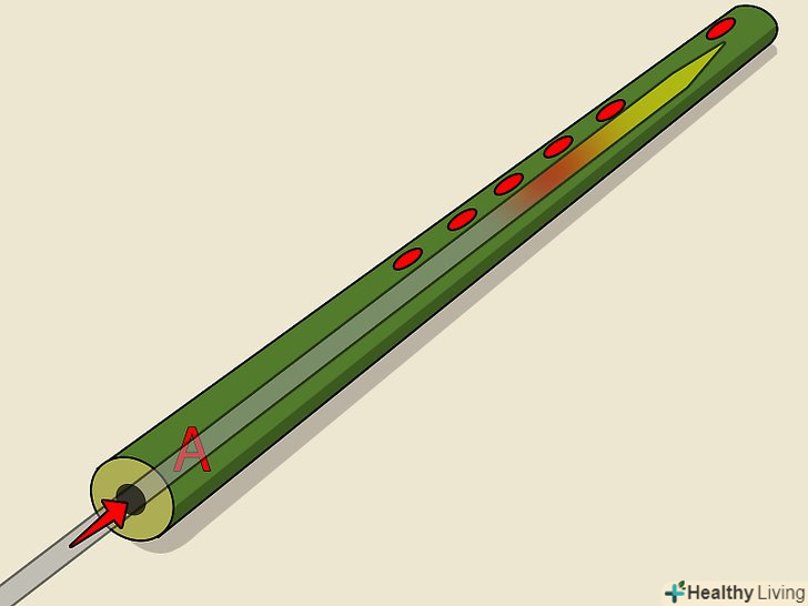 Зробіть отвори в бамбуковій гілці, використовуючи залізний прут.- Зробіть відносно великий отвір у точці "A". Для цього поставте розпечений залізний прут на точку і натисніть на нього. Дерево почне плавитися в тому місці. Продовжуйте процес, поки не вийде потрібний отвір.