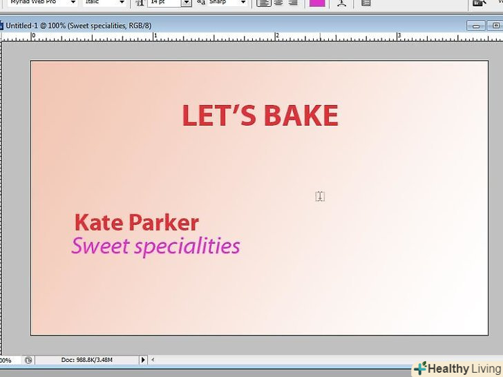 Створіть шаблон відповідного розміру.відкрийте в Photoshop нове зображення і задайте його розмір рівним 8.4 і 5 сантиметрів відповідно. Роздільна здатність-200 пікселів на дюйм або вище. В результаті у вас вийде візитка розміром 8х5, 0,4 см . - це для підстраховки, щоб переконатися, що фарба розтечеться і по краях (тобто що білих кордонів при обрізанні не буде).