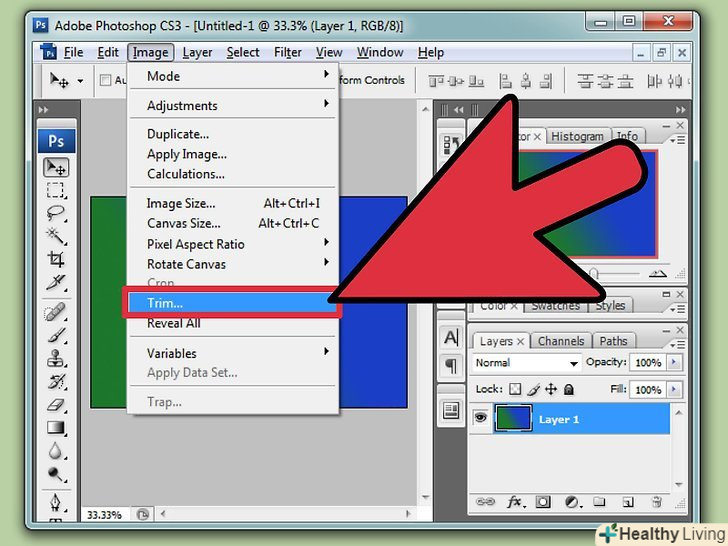 Обріжте фон.зробіть це, щоб видалити зайвий полотно навколо фонового зображення. У рядку меню (зверху) натисніть Зображення – Триммінг. Поставте прапорці у опцій» прозорих пікселів«,» зверху«,» знизу«,» зліва«,»Справа". Натисніть OK.