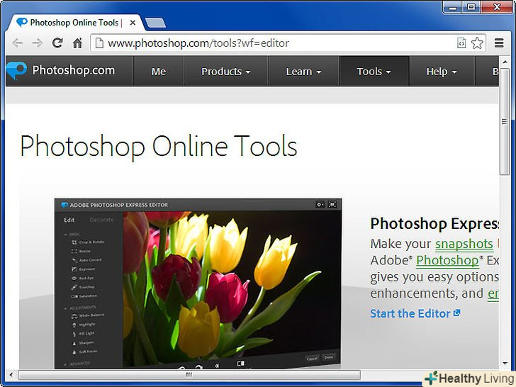 Скористайтеся класичною версією на сайті Photoshop.com. Photoshop.Експрес-редактор це онлайн версія всім відомого фото-редактора. Нехай вона і володіє досить скромним вибором функцій в порівнянні з ліцензованою версією, але ці функції все ж перевершують за своїми можливостями більшість редакторів-конкурентів. Інтерфейс сайту дуже добре продуманий і практичний. Онлайн-редактор володіє широкою палітрою функцій, включаючи спотворення, скетч та інші.- Інтерфейс Експрес-редактора дещо відрізняється від інтерфейсу самого Photoshop. Так що, якщо Ви знайомі з одним, ще не факт, що у вас легко вийде поводитися з іншим.