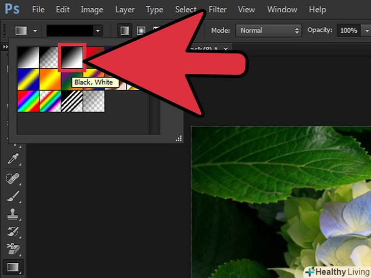 Виберіть чорно-білий градієнт. Він розташований у верхньому ряду третім зліва. Виберіть чорно-білий градієнт. Він розташований у верхньому ряду третім зліва.- Можна використовувати інші градієнти (наприклад, кольорові), але чорно-білий градієнт найкраще підходить для стандартного переходу одного зображення в інше.