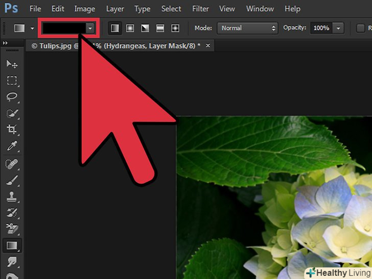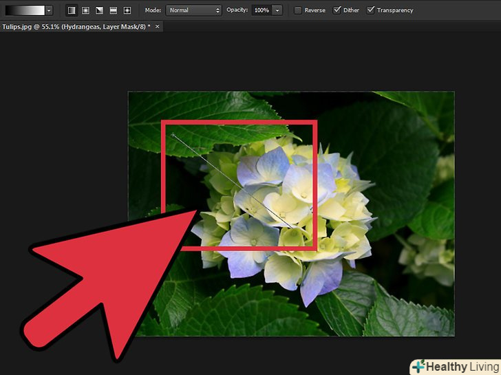 Затисніть ліву кнопку миші і перетягніть покажчик з точки на зображенні, де буде починатися перехід. Затисніть ліву кнопку миші і перетягніть покажчик з точки на зображенні, де буде починатися перехід.- Двічі перевірте, що обрана шар-маска; в іншому випадку плавний перехід працювати не буде.