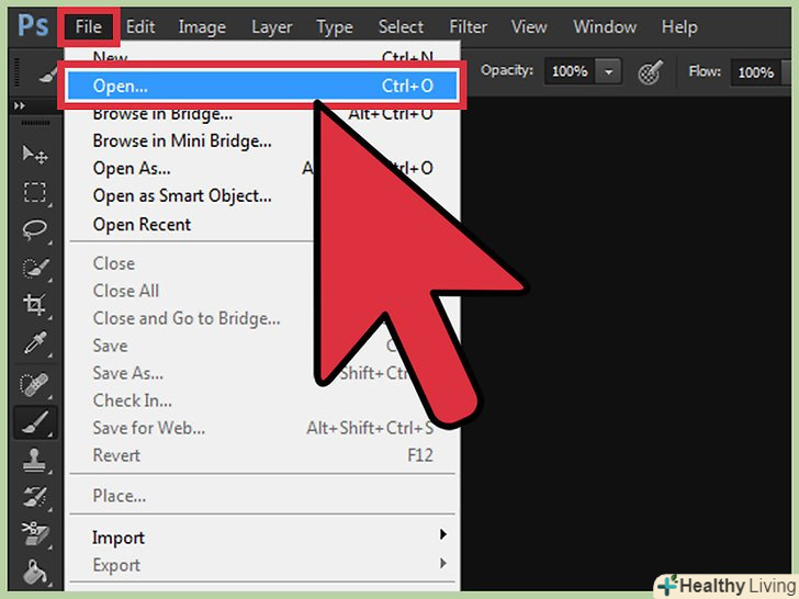 Відкрийте зображення в Photoshop. натисніть «Файл» gt; «Відкрити» і виберіть перше зображення, яке буде базовим. Відкрийте зображення в Photoshop. натисніть «Файл» gt; «Відкрити» і виберіть перше зображення, яке буде базовим.