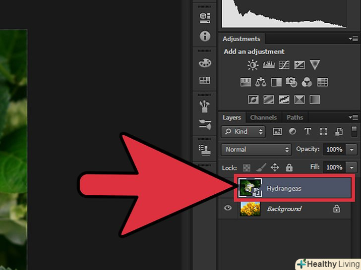 На панелі «Шари» виберіть шар із зображенням, яке буде переходити в інше зображення. На цій панелі відображаються всі шари; за замовчуванням вона розташована праворуч. На панелі «Шари» виберіть шар із зображенням, яке буде переходити в інше зображення. На цій панелі відображаються всі шари; за замовчуванням вона розташована праворуч.