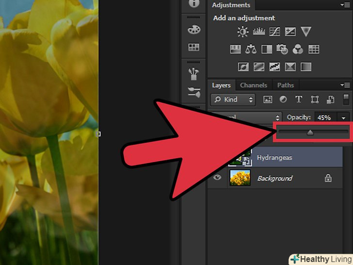 Змініть непрозорість, щоб вона відповідала потрібному рівню прозорості.якщо зменшити непрозорість, зображення стане більш прозорим, тобто можна буде побачити зображення, яке знаходиться під редагованим зображенням. Значення 100% відповідає абсолютно непрозорою картинці, а 0% - абсолютно прозорою. [2] Змініть непрозорість, щоб вона відповідала потрібному рівню прозорості.якщо зменшити непрозорість, зображення стане більш прозорим, тобто можна буде побачити зображення, яке знаходиться під редагованим зображенням. Значення 100% відповідає абсолютно непрозорою картинці, а 0% - абсолютно прозорою. [2]- Також непрозорість можна відрегулювати за допомогою повзунка. Для цього у верхньому рядку меню натисніть "шари" gt;» Стиль шару «gt;»Параметри накладення".