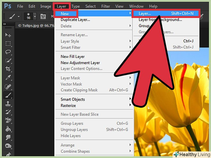 Натисніть " шар "gt;» новий «gt;»шар". це меню розташоване у верхньому рядку меню. За допомогою шарів можна редагувати зображення, при цьому базове зображення не зачіпається. Натисніть " шар "gt;» новий «gt;»шар". це меню розташоване у верхньому рядку меню. За допомогою шарів можна редагувати зображення, при цьому базове зображення не зачіпається.