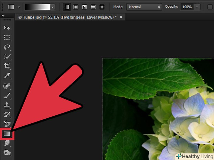 Виберіть інструмент "градієнт" на панелі інструментів.значок цього інструменту має вигляд двох кольорів, які плавно переходять один в одного. За замовчуванням панель інструментів розташована зліва. Виберіть інструмент "градієнт" на панелі інструментів.значок цього інструменту має вигляд двох кольорів, які плавно переходять один в одного. За замовчуванням панель інструментів розташована зліва.- Також можна натиснутиG, щоб взяти вказаний інструмент.