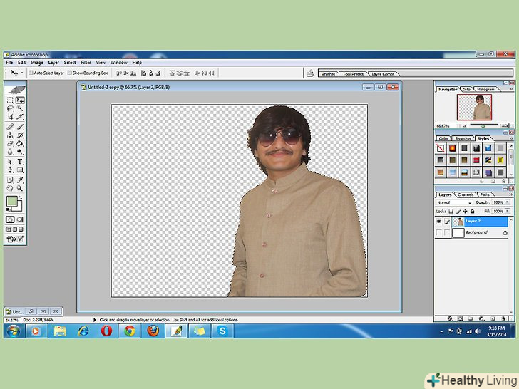 Видаліть фон з фотографій.використовуйте інструменти Magic Brush (магічну кисть) або Magnetic Lasso (Магнітне ласо), щоб виділити себе з вашого фото. Використовуйте кисть " erase "(видалити), щоб «стерти» фон. Вам треба, щоб фон став білим або сірим, це означає, що ви видаляєте будь-який фон, що допоможе зробити фон другого фото краще. Видаліть фон з фотографій.використовуйте інструменти Magic Brush (магічну кисть) або Magnetic Lasso (Магнітне ласо), щоб виділити себе з вашого фото. Використовуйте кисть " erase "(видалити), щоб «стерти» фон. Вам треба, щоб фон став білим або сірим, це означає, що ви видаляєте будь-який фон, що допоможе зробити фон другого фото краще.