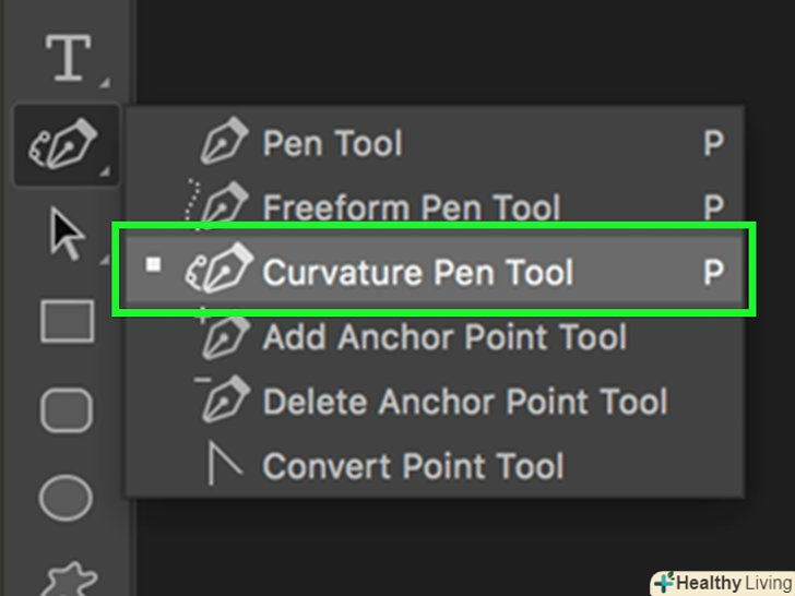 Виберіть інструмент "Перо".Іконка даного інструменту виглядає як вічне перо і знаходиться на панелі інструментів в лівій частині вікна. У випадаючому меню виберіть пункт інструмент "Перо". Виберіть інструмент "Перо".Іконка даного інструменту виглядає як вічне перо і знаходиться на панелі інструментів в лівій частині вікна. У випадаючому меню виберіть пункт інструмент "Перо".